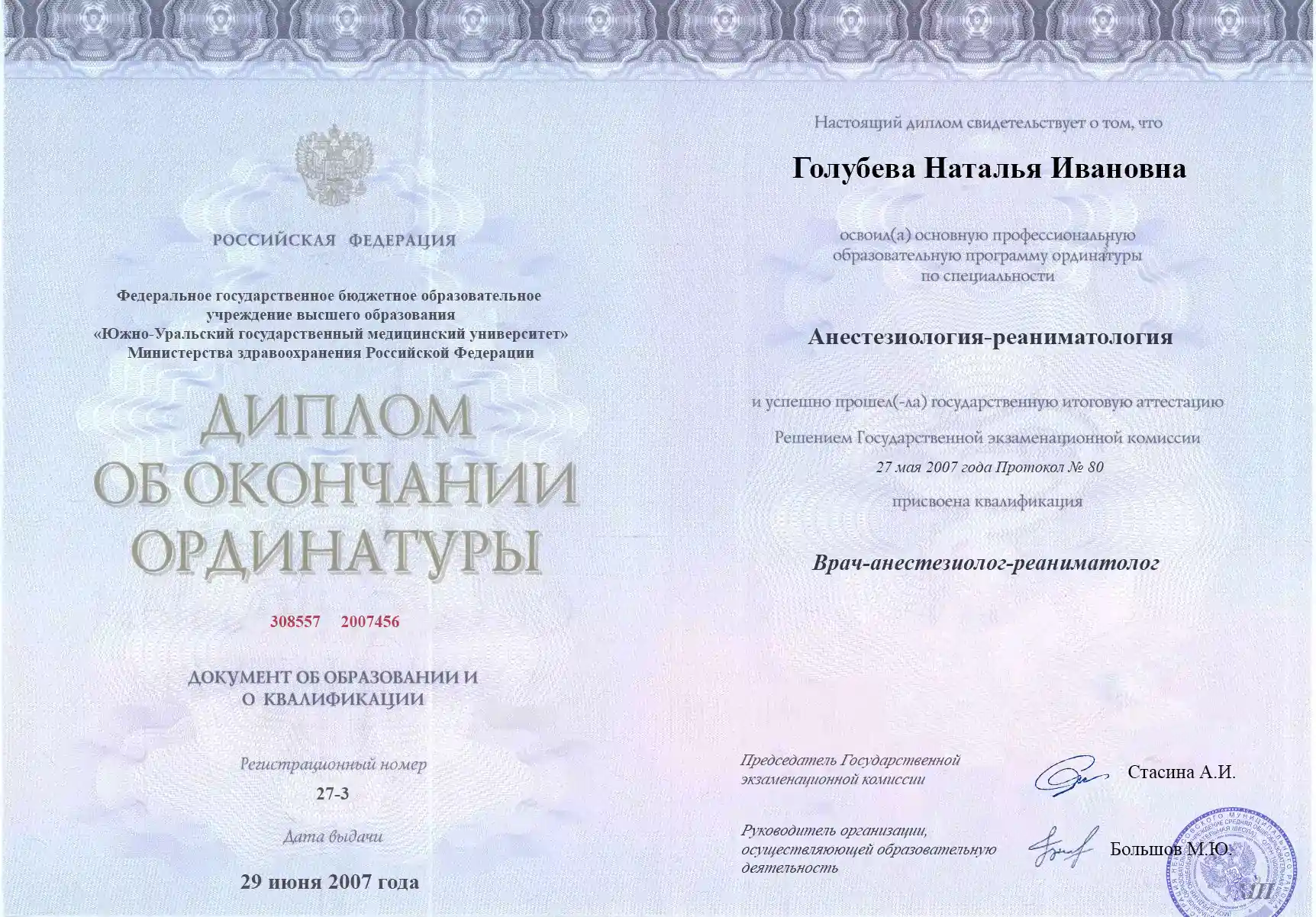 В 2005 году получила диплом по специальности «Лечебное дело» в Южно-Уральском государственном медицинском университете. В 2007 и 2011 году закончила ординатуру и курсы повышения квалификации по анестезиологии и реаниматологии.ПЕРВИЧНЫЙ ПРИЕМ: 2000 руб.